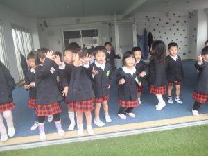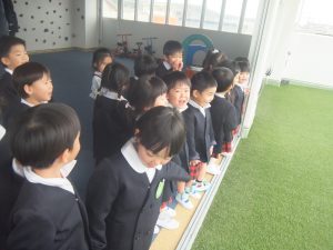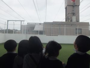 子どもたちは窓の外を見て「雪が降ってる~!」と大興奮!!帰りの会の前に少しだけ屋上に
