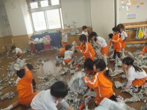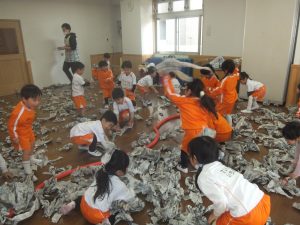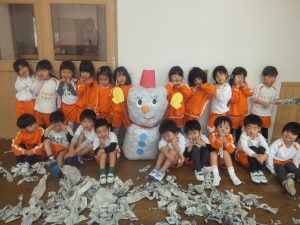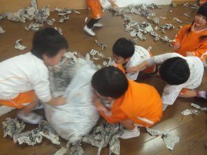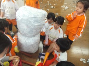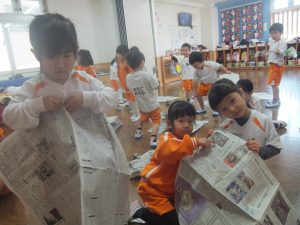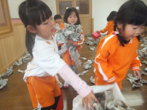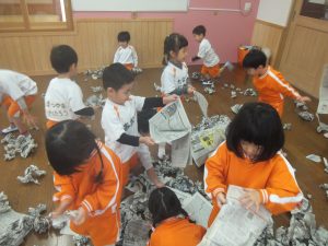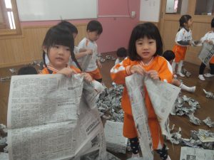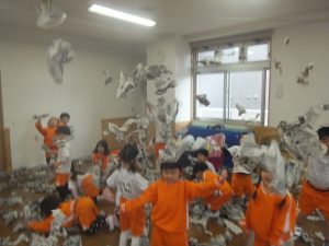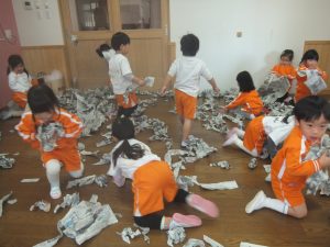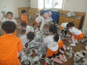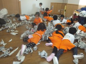残念ながら今日は、積もることもなく、午前中は雪が降ることもなかったので、お部屋で新聞紙を雪に見立てて雪遊びをすることにしました♡
