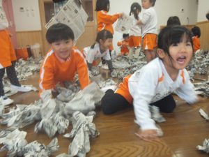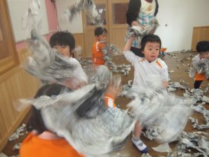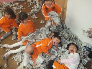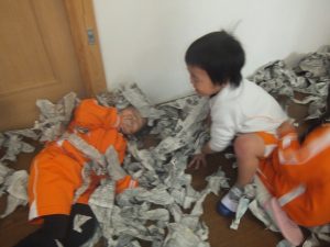 新聞紙をビリビリ破いたり、丸めたり、部屋中にたくさん雪を降らせると雪にダイブしてみたり泳いでみたり、、(笑)