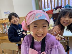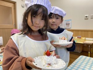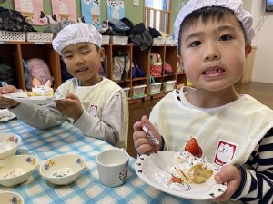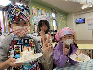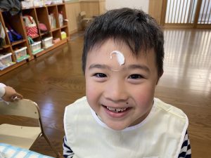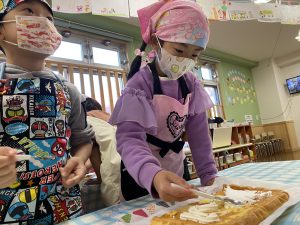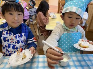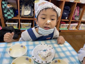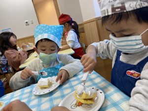 「先生、生クリームまだつけていいの?」とクリームをたくさんつけて大満足の子どもたちでしたよ(*^▽^*)