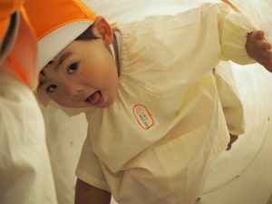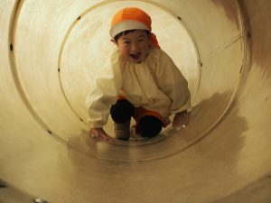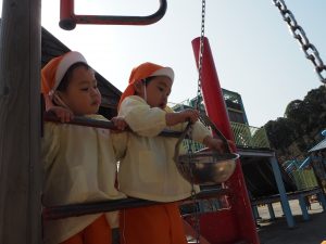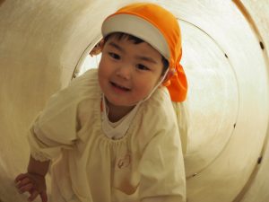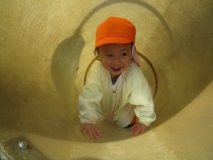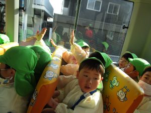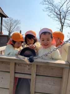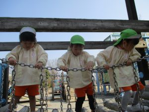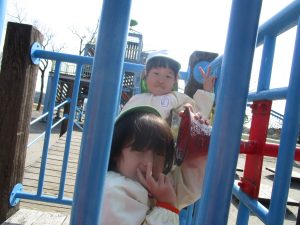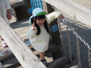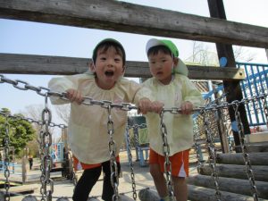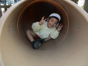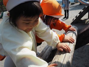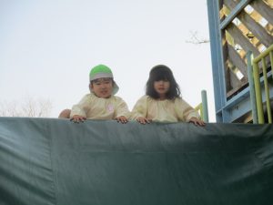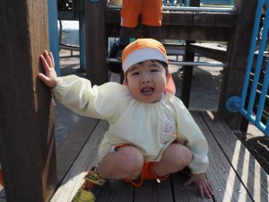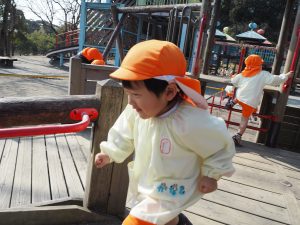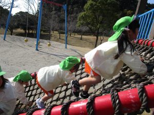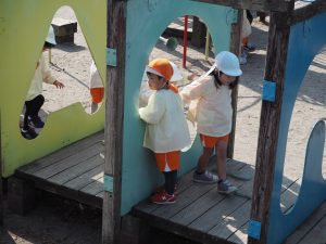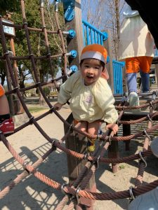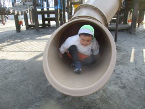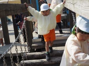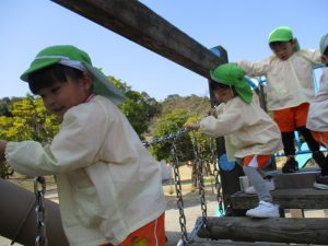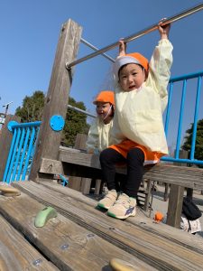 ぱんだ組さんは、いつもとは違う大きい遊具に圧倒される子もいましたが、お友だちが挑戦していく姿を見て、負けじと