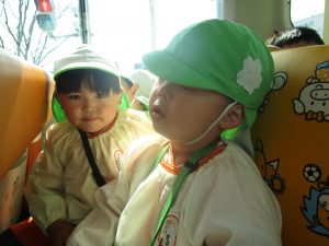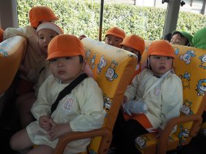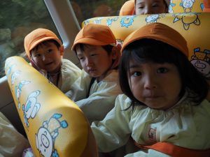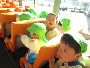 バスに乗って、まずすることはお約束!!「立ったら危ないからダメ」「手すりを持つ!」「大きな声は出さない!」と