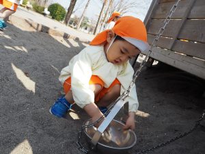 りす組さんさんは、お砂をお皿に入れてひもで引っ張ったり、トンネルの中に入ってみたりとどんどん遊びを見つけて