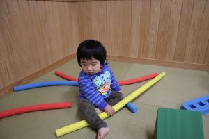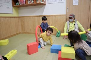 大型ソフトブロックを上手に使い、自分の背より高く積み上げたり枕にしてゴロゴロとリラックスして遊んでいました。