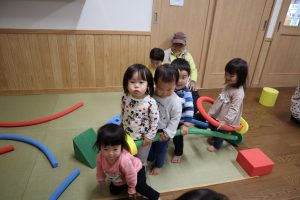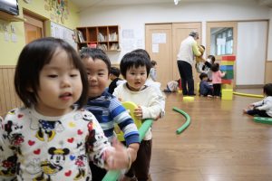 また列車ごっこでは、バスにのってを歌いながら遊んでいました。『ゴーゴー』のところでは手を挙げながら進んでいました。