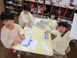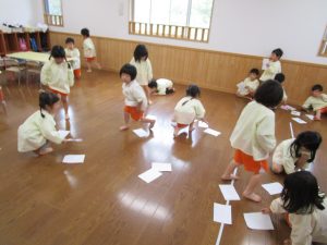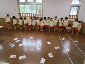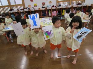 最初は、自分で描いた絵を探して合わせてみました!探しながら「自分の絵を助けるぞ!」「早く見つけるぞ!」と、やる気満々のきりん組さんでした(#^^#)
