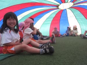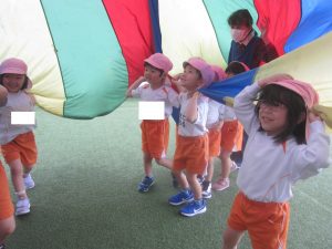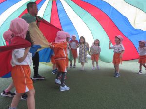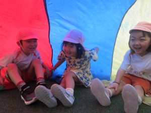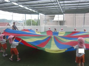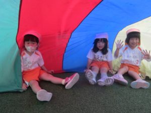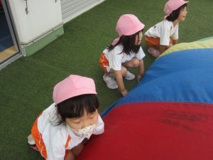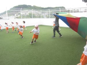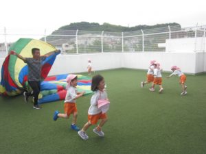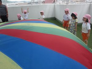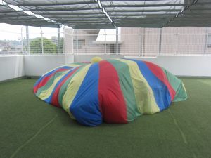 今日は体操教室がありました。午前中は雨も降らず屋上で伸び伸びと遊ぶことができましたよ!今日はバルーンに挑戦。大きくてカラフルなバルーンを見てみんな興味津々でした♪