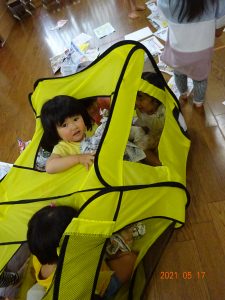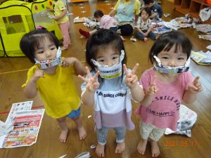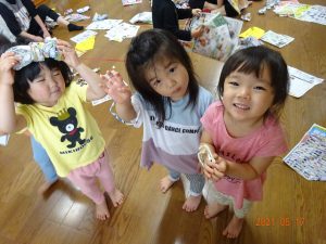 新聞紙をバステントの中に入れてお友だちと遊んだり、マスクやリボンを作ってオシャレをしてみたりとても楽しそうな子どもたち(^▽^)/