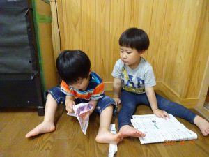 新聞紙遊びやおままごと遊びなど雨の日でも元気いっぱいに過ごしています!