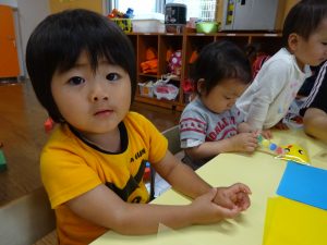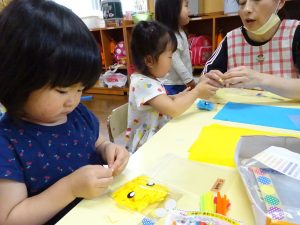 黄色と青の花紙から好きな色を選んでもらい、顔のパーツのシールを貼ったり、水玉のシールを貼ってお洋服に見立てたりしましたよ。