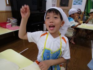 給食の先生のお話をしっかり聞いて