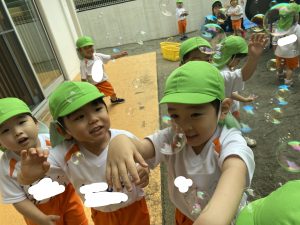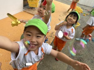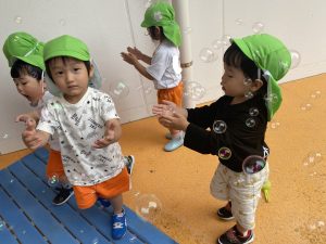 しゃぼん玉を追いかけて割ったり、「しゃぼん玉、食べ放題だー♡」と
