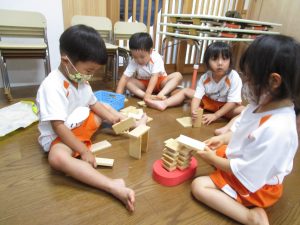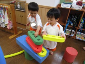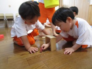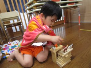 木の板のおもちゃを使って、積み重ねてみたり、動物のフィギュアを