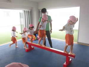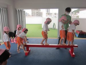 ▽でんぐり返しの後は平均台の上を渡ります。両手を広げてバランスをとり、ゆっくり慎重に進んでいます。