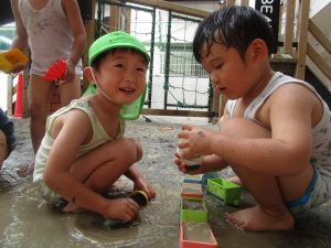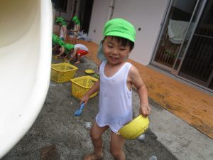 園庭のお砂が、泥んこになるまで水遊び!!
