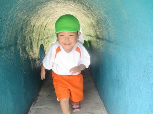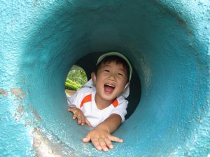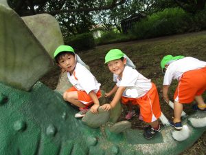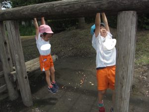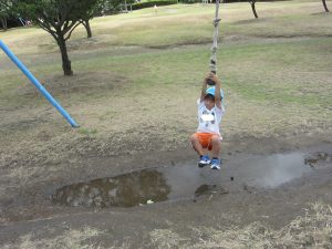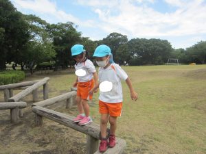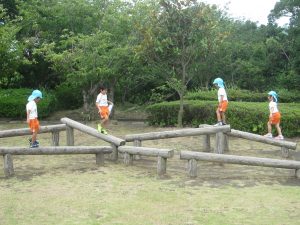恐竜の遊具やターザンごっこ、丸太の上をバランスよく