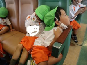 帰りのフェリー、波の揺れが心地よく気持ちよさそう眠っている