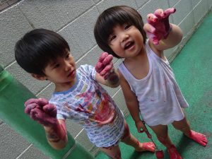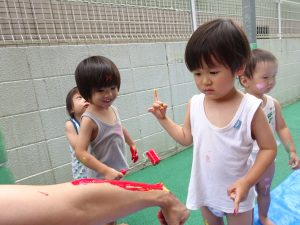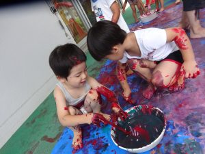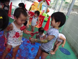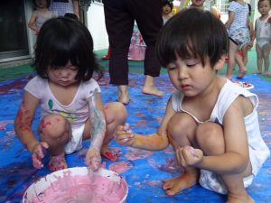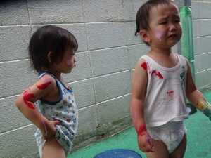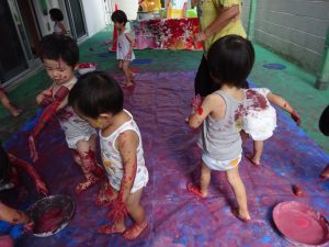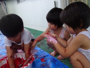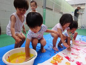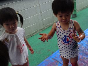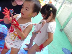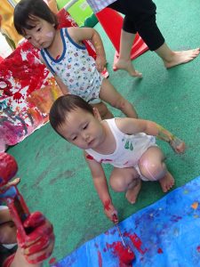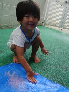最初は絵の具を身体につけることを抵抗していたお友だちも次第に楽しくなってきたのか身体にたくさん絵の具をつけて楽しむ姿が見られましたよ。