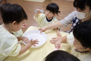 一番初めは、粉の状態に興味津々のこどもたち。