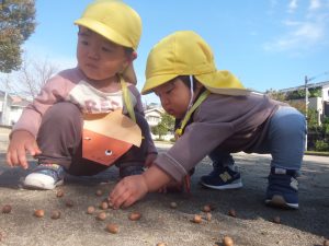 『あっ👀✨』とどんぐりを見つけたことを嬉しそうにする子どもたち🎵