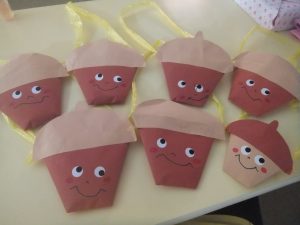 どんぐり拾いに出発する前に、みんなでどんぐりを入れる