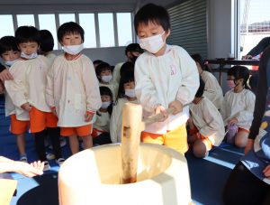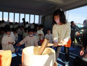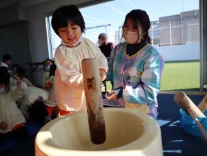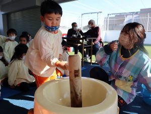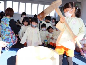 力いっぱいおもちをつき、見ている子どもたちも、掛け声をかけながら、応援してくれましたよ♩