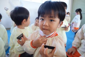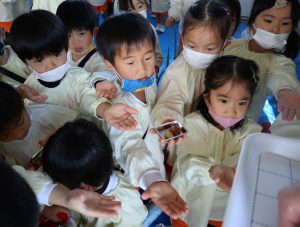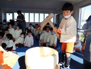 その後、先生たちでおもちをつき、みんなで「よいしょ、よいしょ、よいしょ!」と掛け声をかけてくれましたよ(*^^*)そして、いよいよ子どもたちの番💚