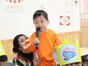ぞう組の誕生者のお友だちが挑戦し、周りのお友だちから「上だよ上」、「そこじゃないよ!もっと右」など指示をもらい頑張りましたよ!