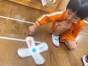 コマを回しながら、「先生、コマ飛んだー!!」と