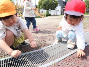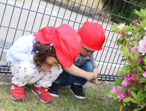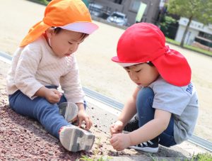 主体的な学び(公園の中でお花や小石等自ら関わっていきます。)対話的な学び(その遊びも一人から二人へと広がっていきます。お友だちと遊ぶ楽しさに気づいていきます。)