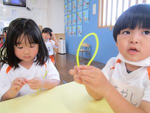 いつもシャボン玉遊びで使っている吹き具は使わずに自分たちで作ることに!