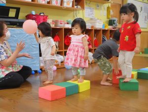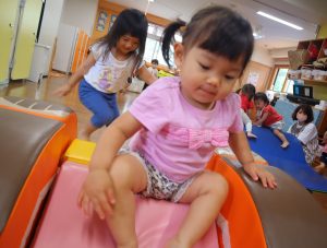 ブロックや滑り台ではブロックの上を渡ってみたり積み重ねてみたり子どもたちで遊びを見つけて楽しめていました(^^)/