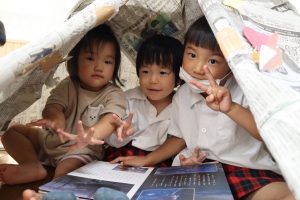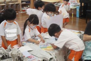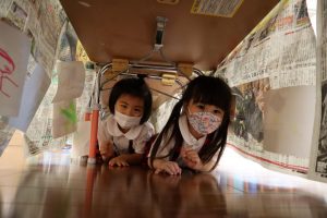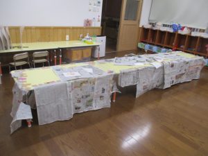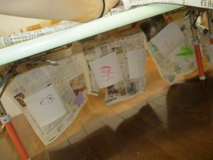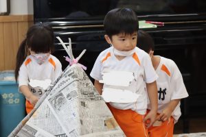 新聞で支柱をつくて、周りに新聞をつけていきます(●^o^●)