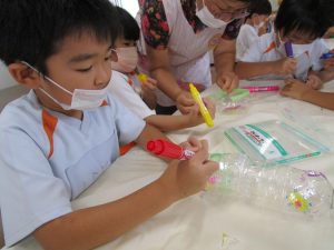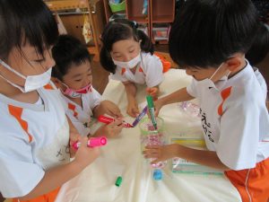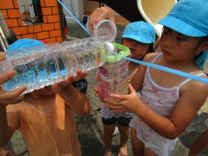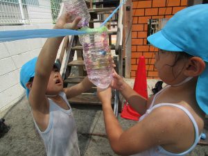 次に、作ったおもちゃをぶらせげて水を入れてみました(●^o^●)