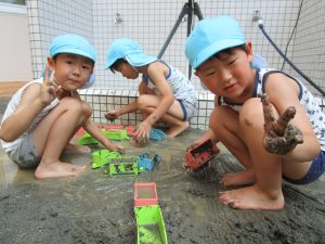 泥んこ遊びの前に、ペットボトルでおもちゃを