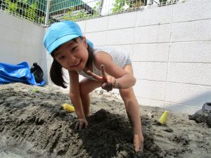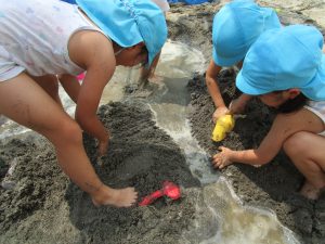 最初は、お団子を作ったり足を砂に埋めたり、電車のおもちゃを走らせたりしました🎵