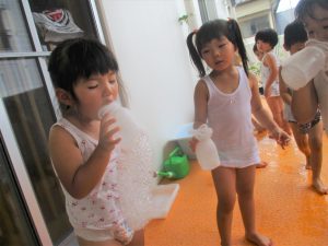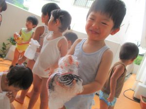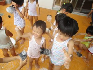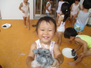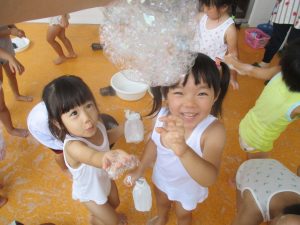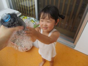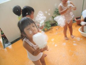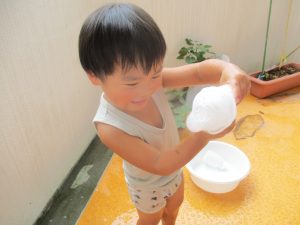 今日は、ベランダで泡遊びを楽しみました♡