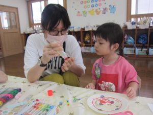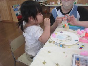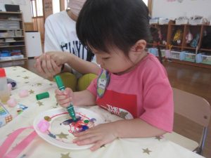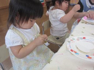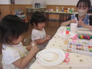 紙皿にシールを貼ったり、クレヨンやペンでお絵描きをしたり、好きな形の折り紙を貼って可愛く飾りつけをしました。