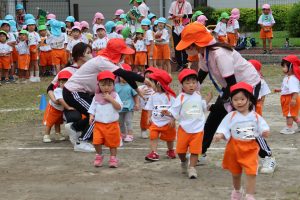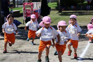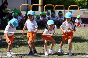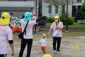 ひよこ組は,親子競技です。初めての運動会。つかまり立ち・伝い歩きができるようになる時期,身体能力も目に見えて発達していますが,まだ独り立ちは難しいです。保護者の皆様のお力を貸していただいての競技となります。