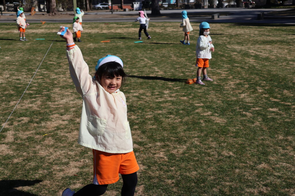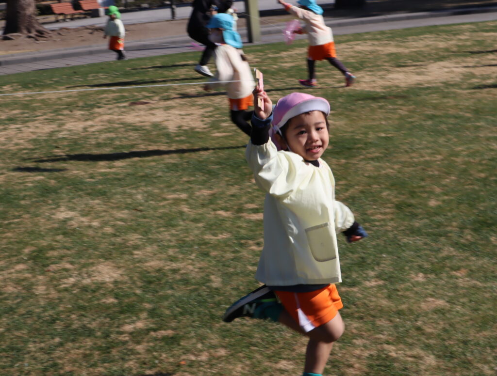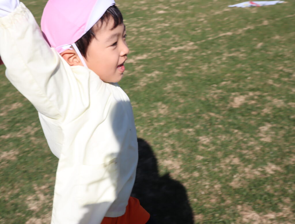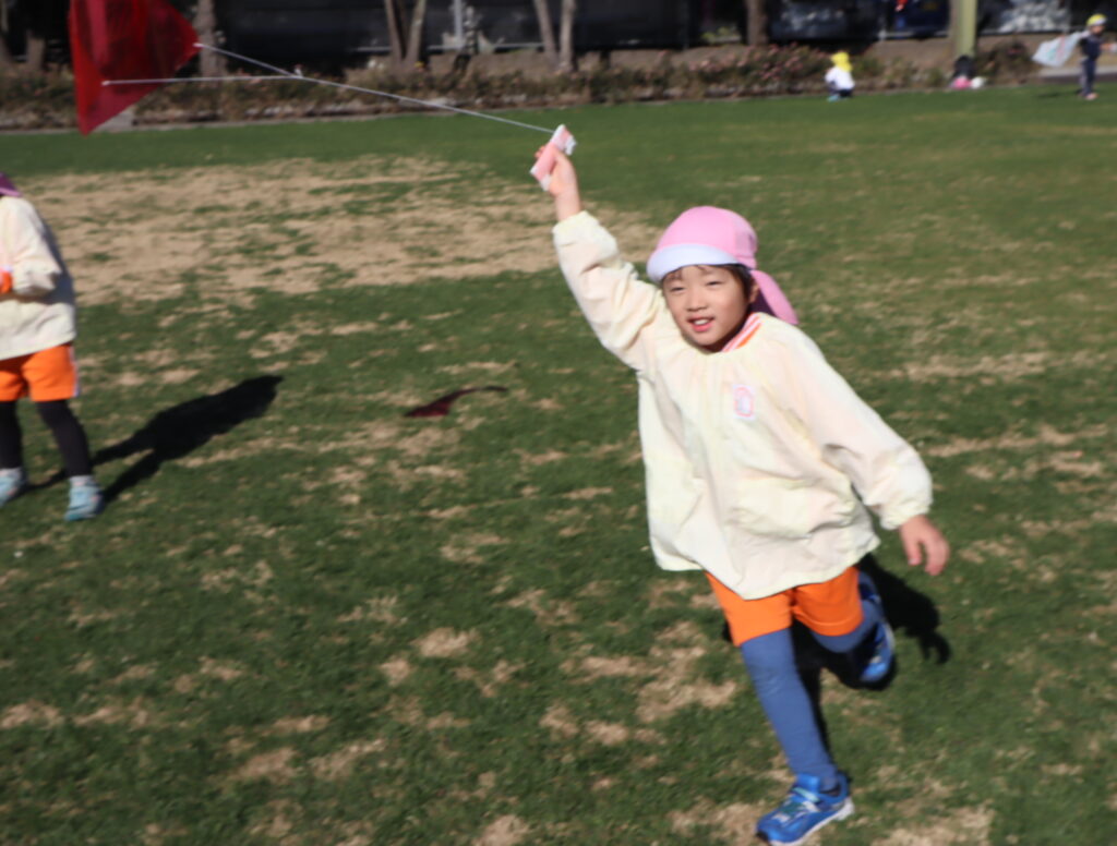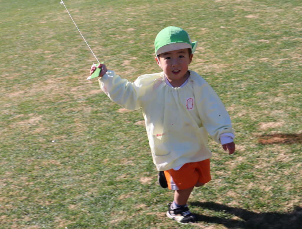 しっかり腕を上げ、元気いっぱい走り、上手に凧を飛ばすことができ、