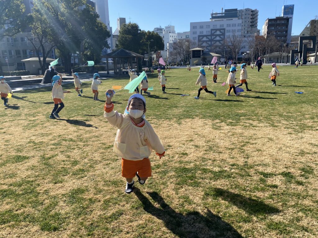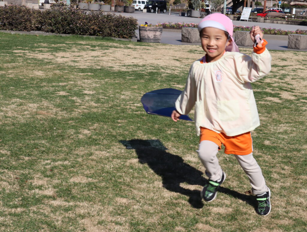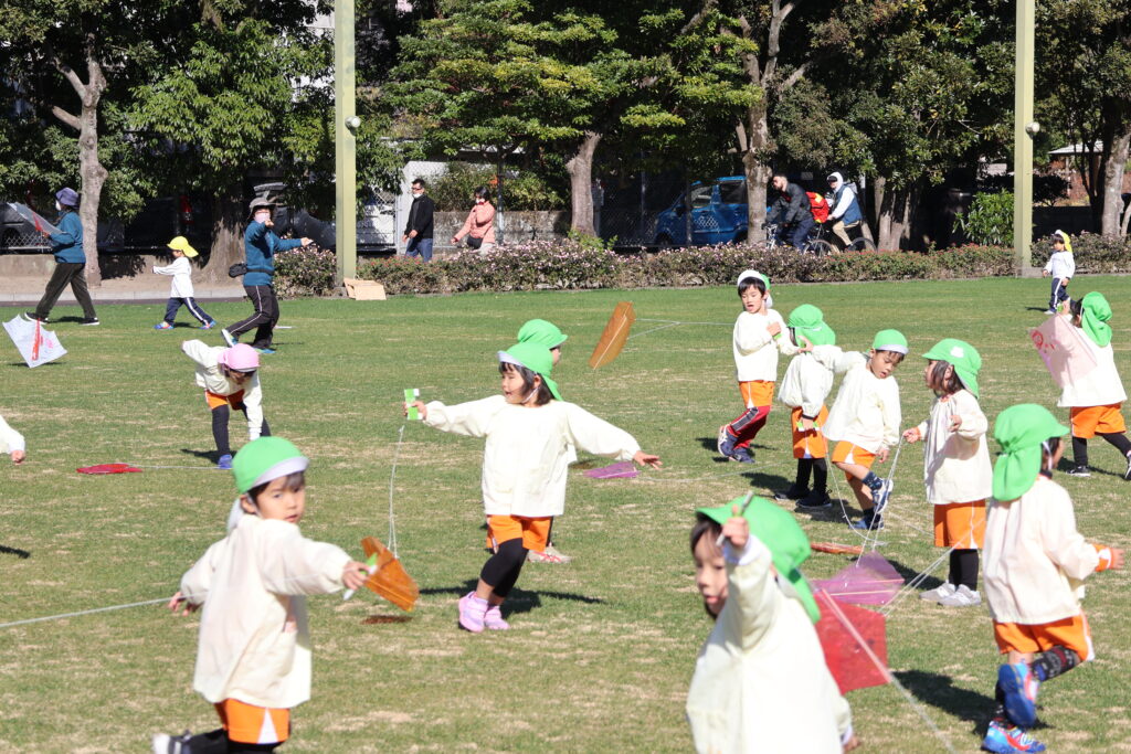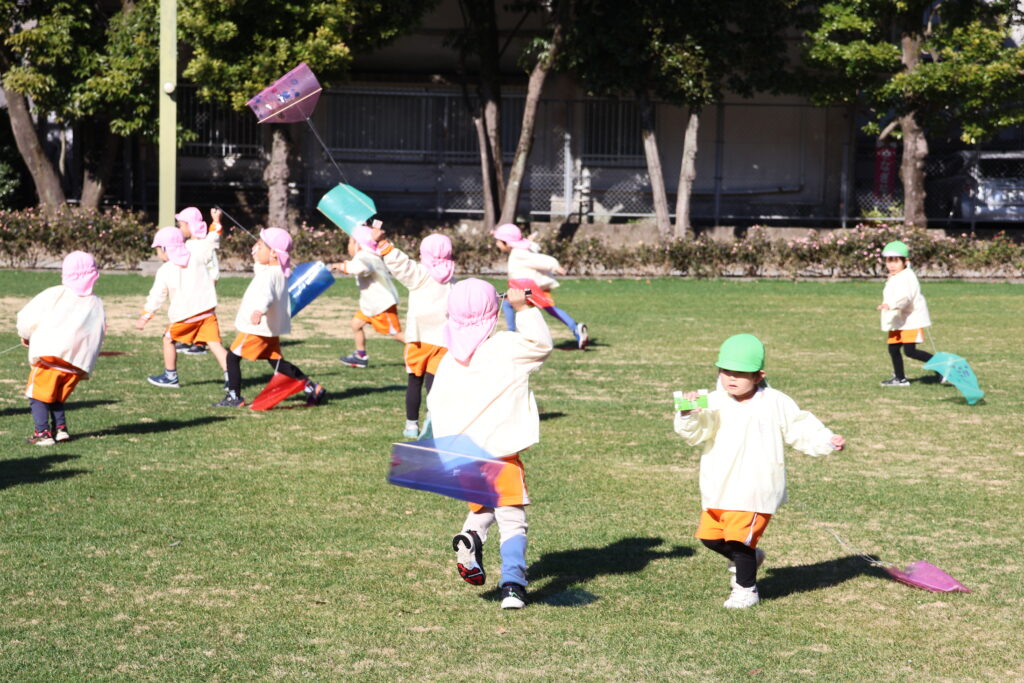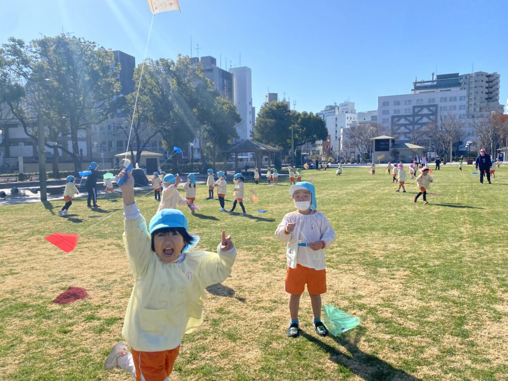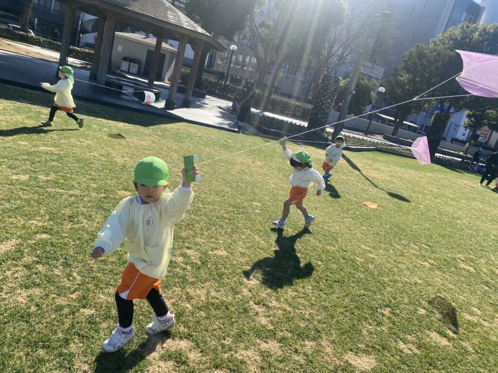しっかり腕を上げ、元気いっぱい走り、上手に凧を飛ばすことができ、