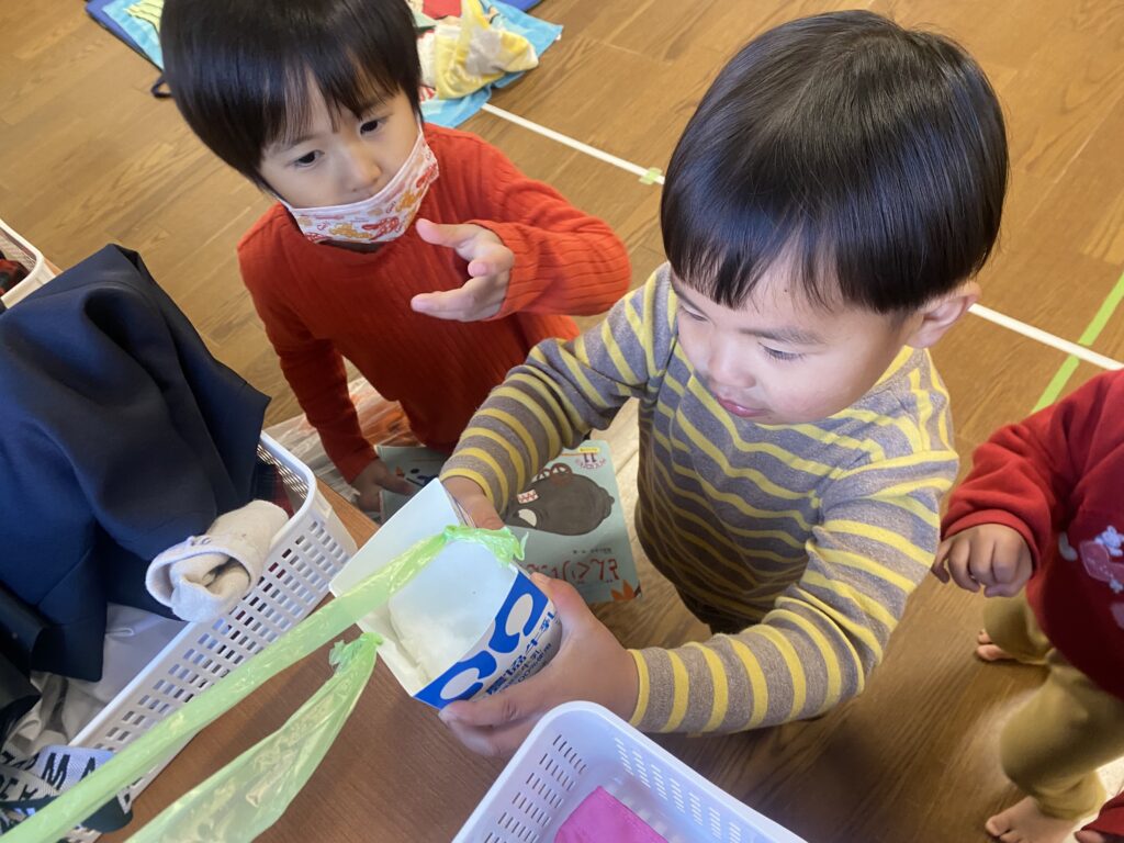 ぱんだ組さんは、牛乳パックを窓やベランダに