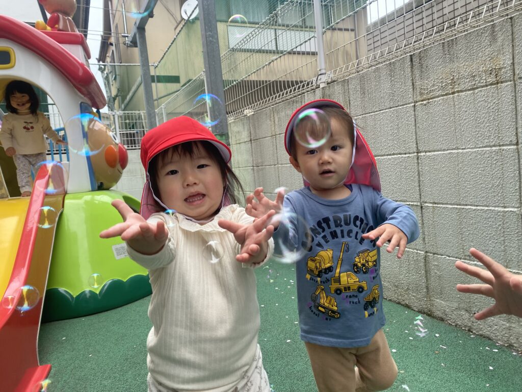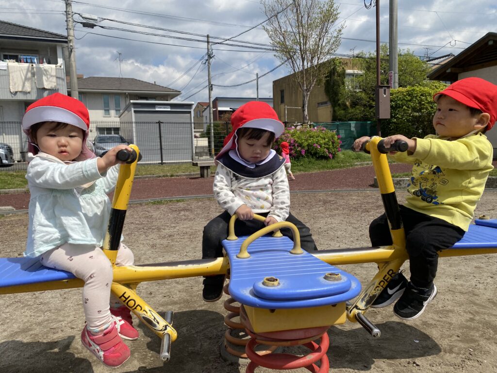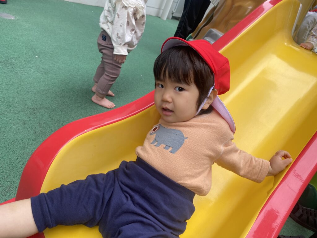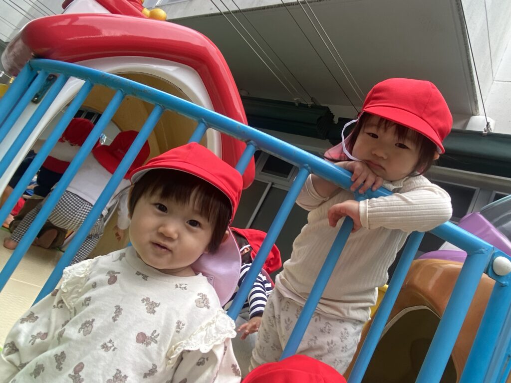 未満児園庭でアンパンマン遊具で楽しく遊んで