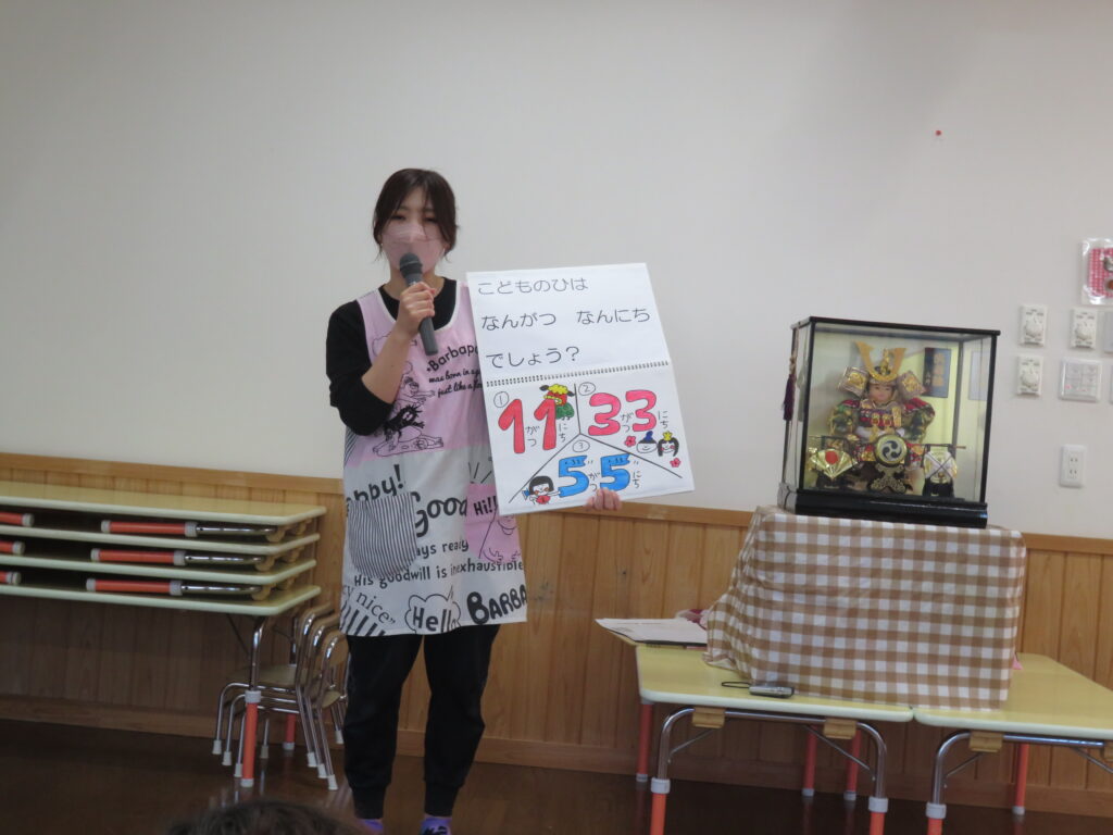 「こどもの日は何月何日?」「こいのぼりをあげるのはなぜでしょう」など、こどものの日にちなんだ3択クイズをし、大盛り上がりの子どもたちでしたよ。(^^♪