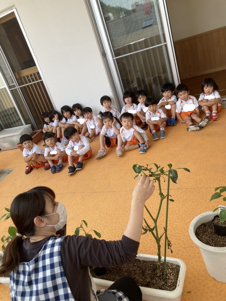 去年のぱんだ組さんが育てたピーマンの苗と今から植える苗を観察し「おおきいね!」と育てることにワクワクのお友だち(^▽^)/