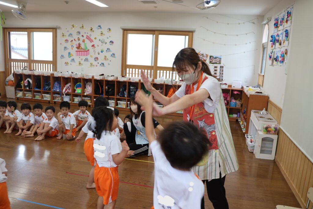 先生が,「おおかみだ。」と言いながらやってきました。お友達を連れていこうとすると,みんなで一生懸命助け合っていました。必死になって,お友達を守っていました。この遊びでも,協力することの大切さを学んだようです。