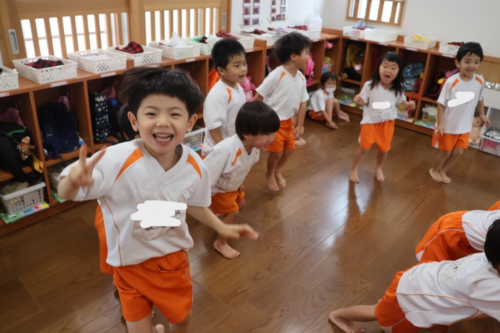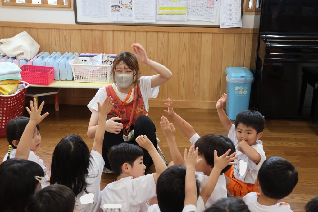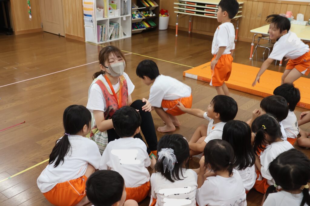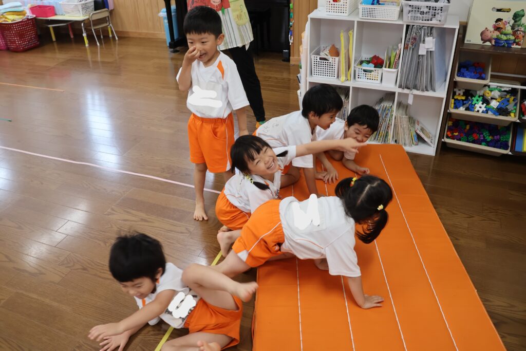 マット遊びを子どもたちと振り返りました。楽しかったこと,もっとやりたいこと,協力することの大切さなど子どもたちと振り返りました。「楽しかったひと」「はーい」と手が上がりました。楽しいマット遊びを通して,先生たちが,子どもたちに経験し,学んでほしかったのは,「協力することの楽しさ」だったように思いました。