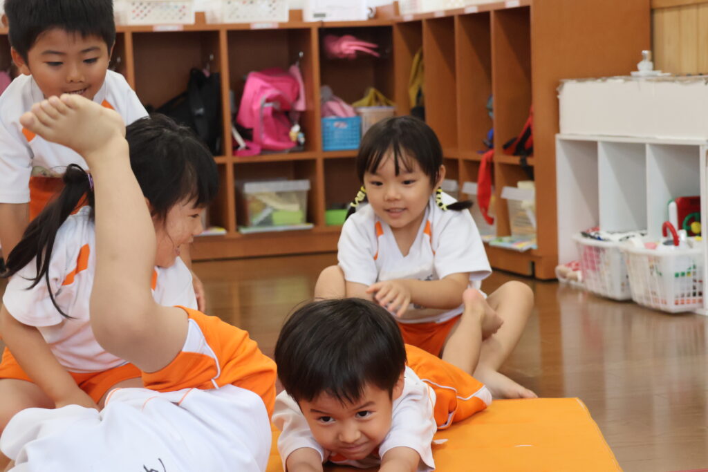 「今度は,みんながおすもうさんになって先生の持っているマットを押してください。先生たちは,力持ちだから,みんなには負けないよ。」子どもたちは必死に力を合わせて頑張りました。