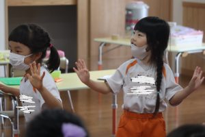 外部講師により年間40時間程度「英会話教室」が行われています。ダンス・音楽・ゲーム等により楽しく英語脳・英語耳」が培われて,小学校からの英語教育に自然な流れで入れるようにしています。