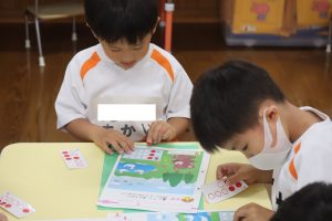 動物の名前あてや数あてなどシート等を活用して文字や数などに関心を持たせるようにしてします。
